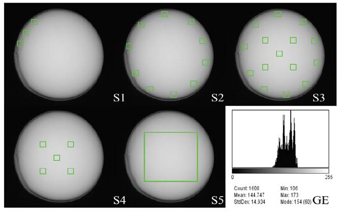 Figure 1. : Gray scale analysis in radiographic images of soybean seeds with different levels of hydration. The letter “S” represents the analysis systems in each image, being; S-embryonic axis region; S2-region of the integument; S3-integument region + cotyledons; S4-points in the cotyledon region, and S5-the entire cotyledon region, in addition to the histogram (GE) with gray values for each system. Systems S1 to S4 represent a square (region of interest) of 1600 pixels and S5 represents 90000 pixels.