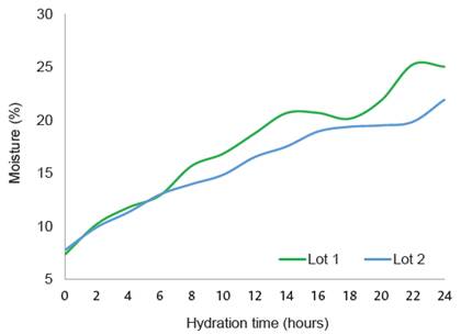 Figure 2: Humidity (%) determined by the oven method in two lots of soybean seeds subjected to hydration in a humid atmosphere for 24 hours. Lot1: smaller seeds (sieve 14/64” = 5.6 mm); lot 2: larger seeds (sieve 18/64” = 7.1 mm).