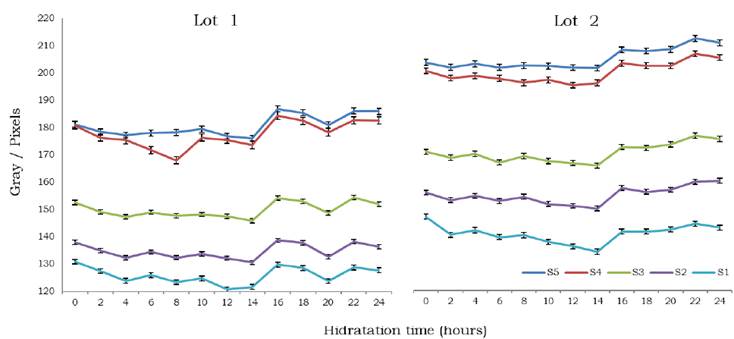 Figure 3: Grayscale values by radiographic image analysis in two lots of soybean seeds submitted to different hydration periods.