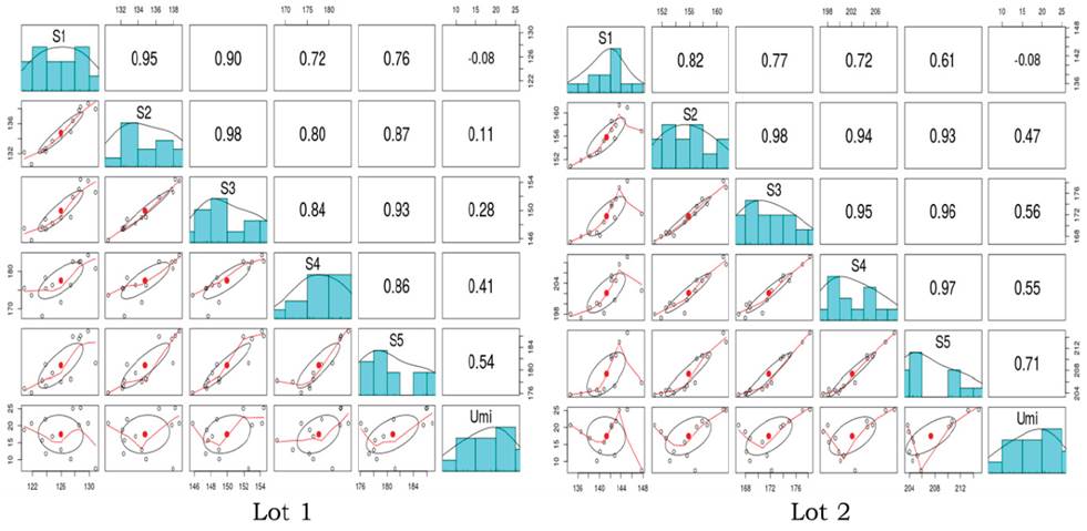The variable degree of moisture determined by the oven method at 105 °C, and the gray scale values, evaluated by the radiographic image analysis systems (S), are shown diagonally in Figure 4 for lots 1 and 2, respectively. These variables, in some cases, showed a correlation between the two methodologies used with soybean seeds in this research. For lot 1, a moderate positive correlation was observed for the degree of moisture and the shades of gray in the cotyledon region determined by S5, with lighter shades of gray within the image, which characterizes a higher degree of moisture in the seed. The areas close to the seed coat and the points in the cotyledon region showed a low positive correlation with the degree of moisture (Umi) (Figure 4). This can be explained due to the globe shape of the soybean seed, which, when the radiographic image (two- dimensional) is obtained, there is less attenuation of the X-ray photons at the seed edge because it has less thickness in relation to the central region. For lot 2, there was a strong positive correlation between the gray tones of the cotyledon región determined by S5 and the degree of seed moisture, evaluated with the oven test, similarly to that observed for lot 1, this region was characterized with shades of lighter gray in the image of the seeds. For areas close to the seed coat and points in the cotyledon region, a moderate to low positive correlation was observed with the degree of moisture, respectively (Figure 4).