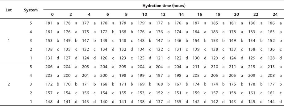 four repetitions of 25 seeds from each lot were used in each hydration period. The moisture determination was done by the oven method at 105 °C (± 3 °C) for 24 hours and the results are expressed in percentage of humidity based on wet matter, according to Brasil (2009).