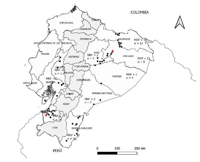 Figure 1. : Sensitivity to flutolanil of M. roreri in Ecuador derived from cacao farms sampled in 2018. Colors are according to the ^0s of the isolates with the two least sensitive are indicated with red dots. mRF indícate median resistance factors by province and n the number of isolates (= n° of farms) to estimate it (ratio of IC50 valúes between resistant and sensitive isolates). From each farm an isolate was cultivated (n), and farms were separated by at least 10 km (GPS coordinates in Supplementary Table 1).