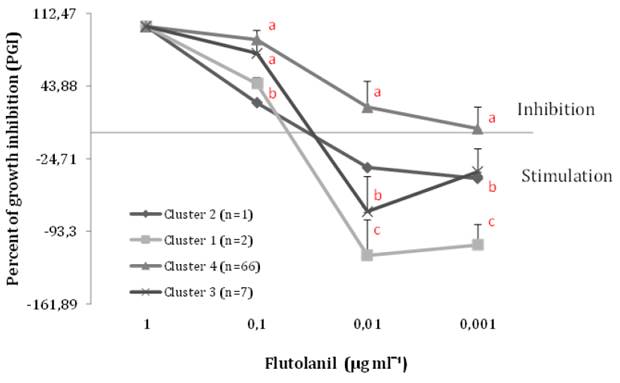 Isolates were grouped by their simultaneous response to the three differentiating concentrations (cluster analysis, Figure 2). Cluster 4 grouped 86 % of the isolates that on average never stimulated growth at any of the tested concentrations. The other clusters (1, 2, and 3) included the rest of the isolates and showed stimulation activity on average at the lowest concentrations. It appears that the isolates from the three clusters were able to adapt their metabolic machinery on the sixth day sufficient to stimulate growth in the presence of flutolanil (Figure 2). This result shows that in the population there are groups of isolates that are stimulated at the two lowest concentrations (Figure 2 Cluster 1, 2, and 3), unlike Table 1 where the identity of the isolates is not considered in each class of PGI.