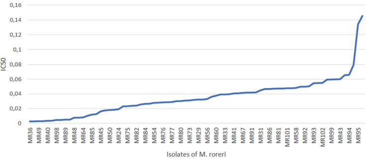 Half inhibitory concentration (IC50). In general, the sensitivity of the isolates to flutolanil was high when IC50 values are lower than 1 μg mL-1 (Edgington et al., 1971). In the present work, the IC50 values were 0.0026 <0.03489 <0.1457 μg mL-1 (min < < max). The least sensitive isolates were MR95 from El Oro province on the Coast (IC50 = 0.1342) and MR68 from the Amazonian province Orellana (IC50 = 0.1457) (Figure 1). Cumulative frequency curve for sensitivity of MR to flutolanil indicates that most isolates (74/76, 97 %) showed IC50s below 0.0885 μg mL- 1, and only 2/76 above 0.1342 μg mL-1 (Figure 3, isolates MR95 and MR68). The ordering of the means indicates an increase of 1.7 times between two consecutive means. This fact separates the less sensitive isolates (MR95 and MR68) from the rest.