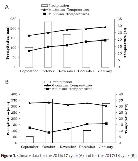 Figure 1: Climate data for the 2016/17 cycle (A) and for the 2017/18 cycle (B).