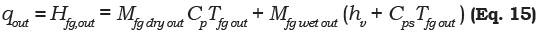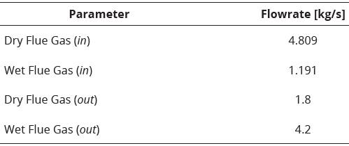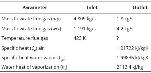 Thus, Eq. 14 and Eq. 15 gives qin = 5593055 W and qout = 8876280 + 10224.108 T fg out respectively. By subbing all components into Eq. 15, we can solve the outlet temperature T fg out = 396.8 K = 123.8 °C. Table 19 below summarizes the parameters determined via the heat and mass analysis as described above.
