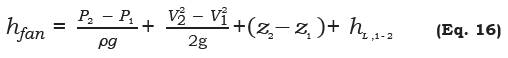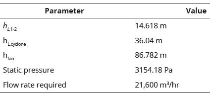 where, P - absolute pressure (Pa), V - velocity (m/s), z - elevation (m), h L ,1-2 - head loss (m). The h L ,1-2 can also be described as h L , 1-2 = h dryer + h cyclone . Table 22 below contains the parameters, equations, and assumptions made to solve for the required fan head.