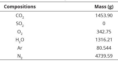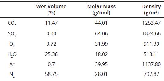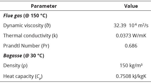 The humidity of the bagasse H = (mv/ma) can be found using the molar volume of the flue gas at operating temperature (155 °C), where mv = mass of moisture present, ma = total dry mass. Trial and error methods were conducted to determine the expected drying parameters at the low drying time. For an arbitrary volume of 10 m3 bagasse, the calculation is made to obtain the mass of flue gases (Table 7) and drying parameters (Table 8). The drying time is within the expected range for a flash drying system.