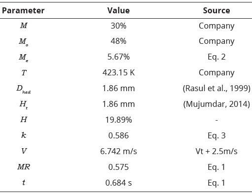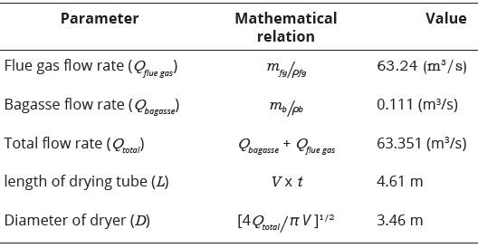 According to the company, the estimated flue gas exiting from the boiler is m fg = 227,672 kg/hr assuming pfg = 1 kg/m3 of gas flow. The bagasse flow rate is m b = 60 tph assuming pb = 150 kg/m3 of bagasse flow. Calculating a total flow balance with the summation of the flue gas and bagasse flow, we can determine the desired diameter and length of the dryer (Table 9).