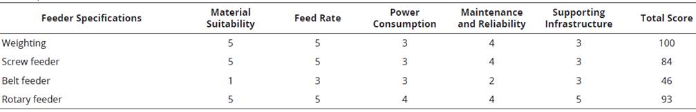 After consultation with the company about the importance of design aspects and design requirements, a weighted decision matrix (Ouye, Facility Technics Facility Management Consulting) was devised for selecting the best- fitted feeder for the dryer design. The rotary feeder has found as the most appropriate choice for both the inlet and outlet feeders (Table 3). Using the boiler and bagasse information (Table 1-2), the required volumetric feed can be calculated as ~0.111 m3/s.