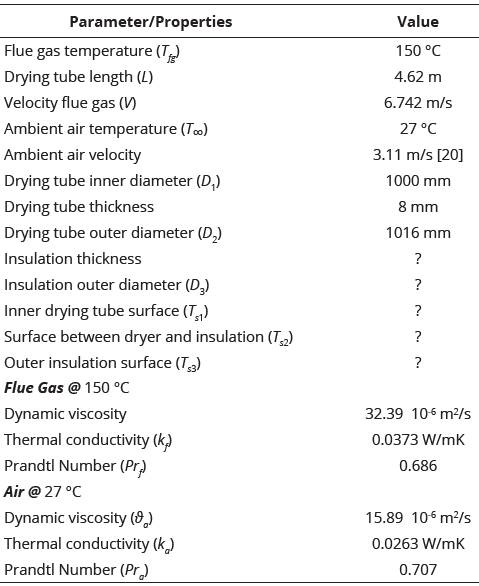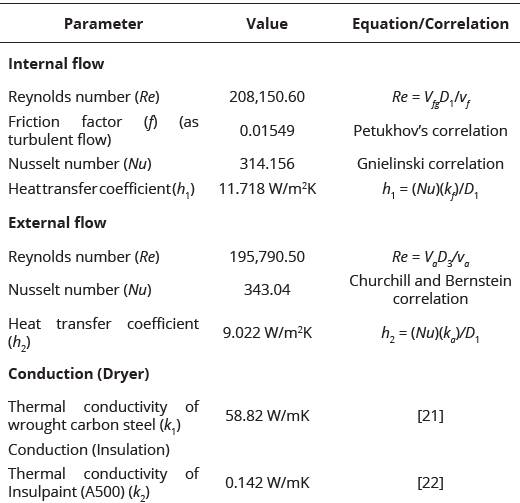 Table 14 summarizes the additional parameters used, and the correlations or equations used to find them. The heat transfer throughout the drying tube occurs via three mechanisms, (i) Convective (internal flow), (ii) Conductive (through drying tube, and insulation) and (iii) Convective (external flow) (Table 15).