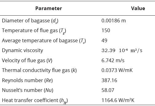 where, Є s = solid volume fraction in the mixture, d s = diameter of bagasse particle (m), h gs = heat transfer coefficient (W/m2K), T g = temperature of the gas, and Ts = average temperature of the bagasse. The solid volume fraction is calculated as Є s = Q b /(Q b +Q g ) = 0.111/ (0.111+6.0) = 0.01816. Using the Baeyens et al. (Maurice, Mezhericher, Levy, & Borde, 2015) correlation for the Nusselt’s number, the heat transfer coefficient can be established and the heat transfer rate calculated (Table 17).