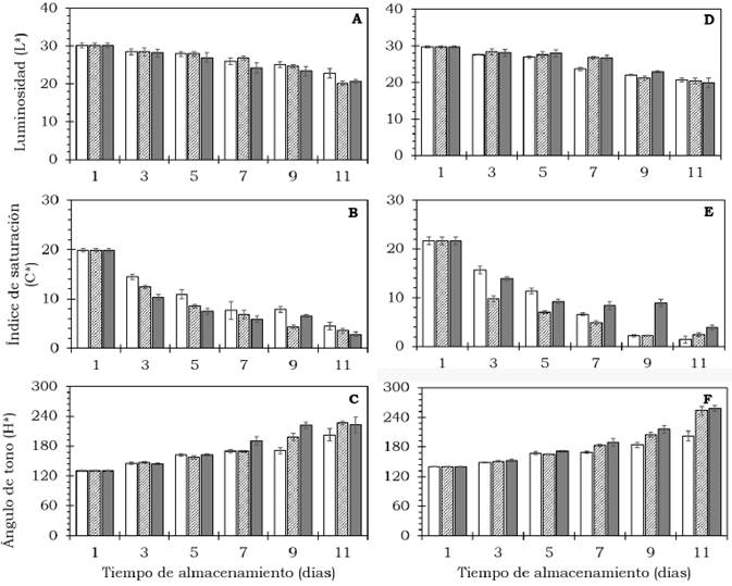 Figura 3: Comportamiento de los componentes del color en frutos de aguacate cv. Hass (A, B, C) y cv. Méndez (D, E, F) tratados con: 0 (), 500 () y 1000 () mg L-1 de etefón y almacenados a 20 ± 2 °C. Medias ± DE, n = 5.