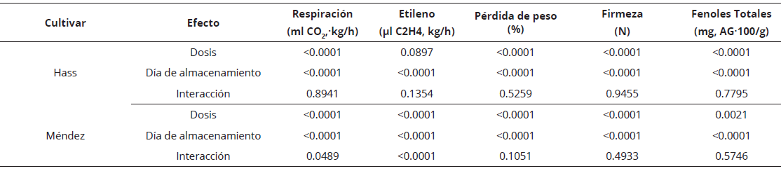 Tabla 1: Resultados del p-valor de los principales efectos e interacciones de la dosis de etefón y tiempo de almacenamiento en los análisis mediante la prueba de Kruskal-Wallis, en variables de calidad poscosecha para los cultivares de aguacate Hass y Méndez.
