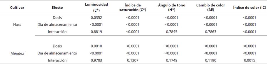 Tabla 2: Resultados del p-valor de los principales efectos e interacciones de la dosis de etefón y tiempo de almacenamiento en los análisis mediante la prueba de Kruskal-Wallis, en color externo para los cultivares de aguacate Hass y Méndez.