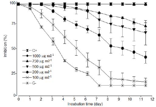 The results obtained here are also superior to those obtained in a similar study where the agrochemical Azoxystrobin (1250 mg L-1) was used, which led to an inhibition of 78 % of mycelial growth (Torres-de-la-Cruz et al., 2019).