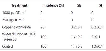 The growth of the fungus was completely inhibited during the entire incubation period at a concentration of 1000 μg ml-1 EO (p < 0.001), a similar result to that achieved with the control treatment, which in the in vitro experiment corresponded to Copper oxychloride (Figure 2, p < 0.001). However, treatments with an EO concentration of 100 to 250 μg ml-1 had no effect on the inhibition of M. roreri (p < 0.001).