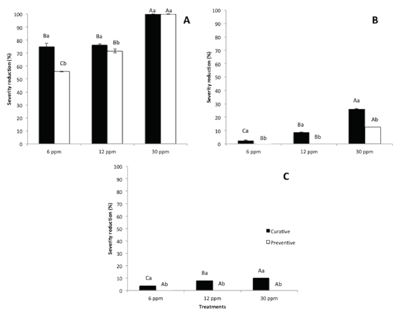 Figure 2. : Effect of lesion diameter reduction of artificially inoculated fruits, stored at 27 °C during 15 days. A) Persian lime; B) Banana; C) Papaya. Persian lime and Banana n = 20 and for papaya n = 10. For concentration of treatments, mean values followed by different capital-case letter are significantly different (P < 0.05). For each type of protection (curative or preventive), mean values followed by the different lower-case letter are significantly different (P < 0.05) according to Tukey intervals.