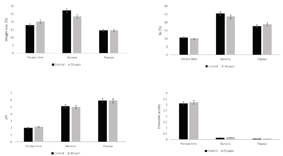 Also, during the storage time, the changes on weight loss of treated fruit were recorded using a digital balance (Sartorius BL 3100), weight losses were expressed as percentage considering the loss of the initial weight. Total soluble solids (TSS) was assessed by using a digital refractometer (ATAGO PAL-1, Japan) and expressed as % Brix. The pH was determined using a Hanna Instruments HI 2210 potentiometer. Titratable acidity (TA) was calculated by titrating 5 g of sample with 0.1 m NaOH, values were expressed as percentage of citric acid (Persian lime and papaya) (mole equivalent = 0.064) or percentage of malic acid (Banana) (mole equivalent = 0.067).