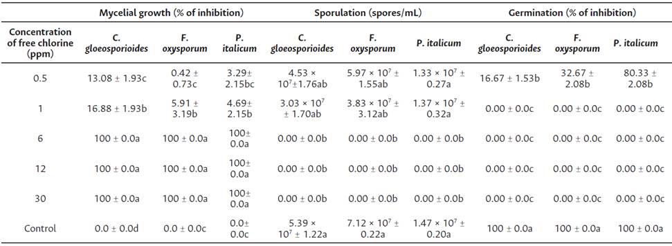 Efficacy of EOW treatments in the reduction of colony diameter is shown on Table 1. The inhibition of mycelial growth increases according to free chlorine concentration. Significant difference (P < 0.05) between treatments was observed. The best results were obtained with the treatments of 6, 12, and 30 ppm of free chlorine controlling totally the fungi development of all strains tested. In sporulation assessment, the results showed (Table 1) that the application of EOW at 6, 12, and 30 ppm of free chlorine inhibited completely sporulation process compared to control. A significant difference (P < 0.05) between treatments was observed. Total inhibition of germination process was recorded in all strains tested.