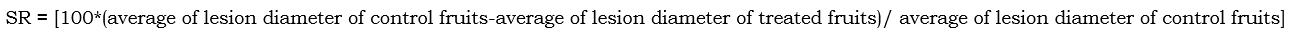 The disease incidence (percentage of infected fruits) and severity reduction (percentage) of EOW treatments were evaluated. Disease incidence (DI) was calculated with the formula: