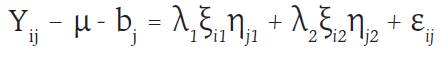 Where Yij corresponds to the average genotype yield of the i (i = 1...10) genotype in the j (j = 1...6) environment; μ is the general media; b. is the effect of the j environment; represents the first principal component (PC1);