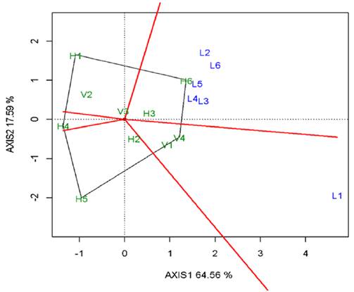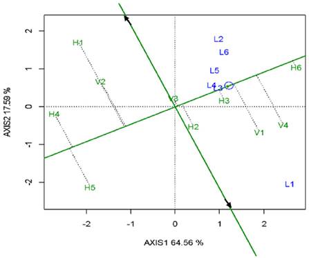 The analysis allowed the identification of two mega-environments, the first one with the ‘Soberana Fl’ (V4) as ‘winning genotype’ and grouped L1 (INIA Guárico), while the second one grouped the rest of the locations, having the hybrid ‘RHA-180’ (H6) as ‘winning genotype’.