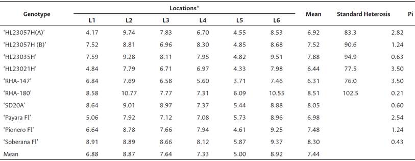 Yield means per cultivar per location (t ha-1) and the overall mean (Table 3) showed that cultivars with the best performance per location were the hybrids ‘RHA-180’ in the locations L2, L5, and L6, the varieties 'Soberana Fl’ and ‘SD20A’ in L1 and L3, respectively, and the hybrid HIAAL ‘HL23057H (B)’ in L4, while ‘RHA-147’ and ‘HL23021H’ had the worst performances. The locations with the highest yield means were L6, L2, L3, in decreasing order, and L5 with the lesser means.