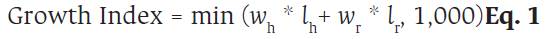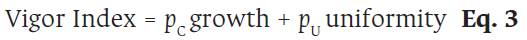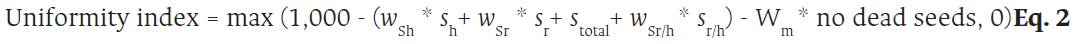 Where: lh and lr: sample means of hypocotyl and root length; sh, sr, stotal and sr/h: standard deviation of hypocotyl and" root length total length and ratio between root and hypocotyl; pC and pu: weight of growth and uniformity indexes; w: weight of the parameters.