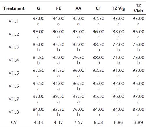 Means followed by the same lowercase letter in rows belong to the same group, according to the Scott-Knott test at 5 % probability; V1: variety 1; L(n): lots from 1 to 8; G: germination standard test; FE: field emergence; AA: accelerated aging; CT: cold test; TZ Vig: Tetrazolium vigor; TZ Viab: Tetrazolium viability.