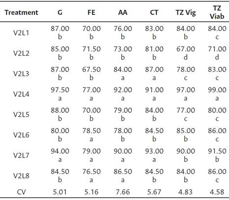 Means followed by the same lowercase letter in rows belong to the same group, according to the Scott-Knott test at 5 % probability; V2: variety 2; L(n): lots from 1 to 8; G: germination standard test; FE: field emergence; AA: accelerated aging; CT: cold test; TZ Vig: Tetrazolium vigor; TZ Viab: Tetrazolium viability.