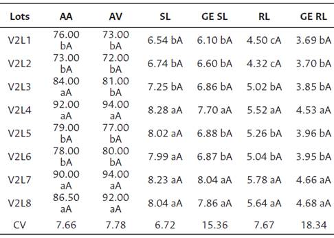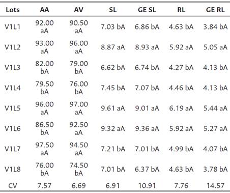 Means followed by the same lowercase letter in rows and upper-case letters in lines belong to a same group according to the Scott-Knott test at 5 % probability level. V2: variety 2; L(n): lots from 1 to 8; AA: accelerated aging; AV: automatic vigor; SL: seedling length by manual measurement; RL: root length by manual measurement; GE SL: seedling length by GroundEye; GE RL: root length by GroundEye.