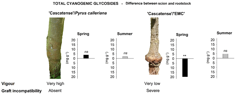 In pear/quince combinations, the CG prunasin, which occurs in the quince and not in the pear, rises from the rootstock to the cultivar, where it is hydrolyzed by β-glycosidase, causing the release of cyanide at the graft interface (Gur et al., 1968). Thus, the levels of CGs in scion and rootstock can serve as indicators of compatibility (Gur & Blum, 1973; Pereira et al., 2018).