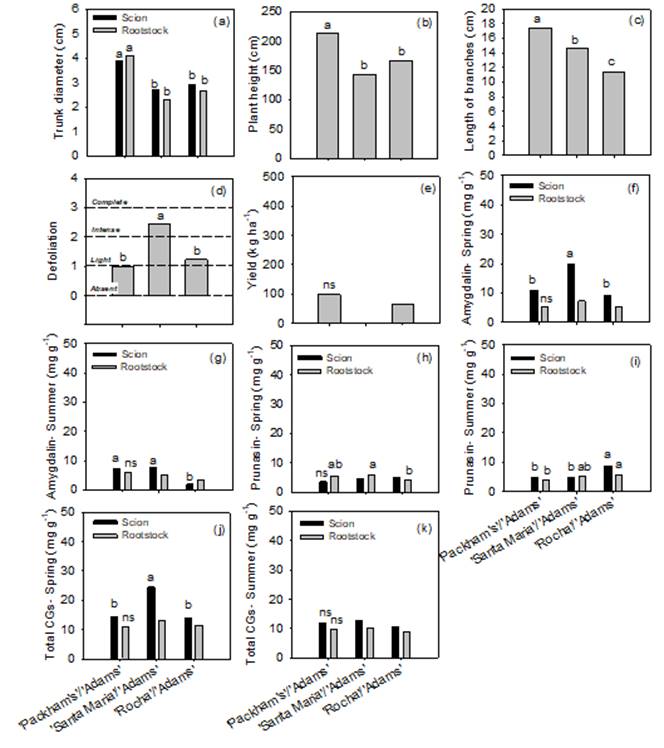 In the spring, ‘Santa Maria’ showed a higher amygdalin level than the other cultivars grafted on ‘Adams’ (Figure 3f). In summer, ‘Packham’s Triumph’ and ‘Santa Maria’ cultivars showed higher amygdalin levels (Figure 3g). Regardless of time year, there were no differences in the amygdalin concentration of rootstocks from studied combinations (Figures 3f and 3g). For prunasin in the spring, there were no differences between cultivars (Figure 3h). However, the rootstock ‘Adams’ had a higher concentration of prunasin when grafted under ‘Santa Maria’ (Figure 3h). In the summer, the combination Rocha/Adams showed a higher content of prunasin in the cultivar and rootstock, without differing only from the Rocha/Adams in the rootstock (Figure 3i).