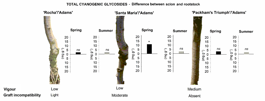 It was also possible to observe that even in the pear/pear combination (P. communis/P. Calleryana), significant amounts of amygdalin and prunasin were found. Indicating that, differently from what was suggested by Gur et al. (1968), the pear has cyanogenic glycosides in its tissues, however, in concentrations lower than that found in quince trees.
