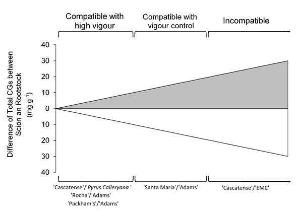 Among studied combinations, in both experiments, combinations with different levels of grafting incompatibility and CG concentrations were identified. Cascatense/P. Calleryana, Packham’s Triumph/Adams, and Rocha/Adams, had similar concentrations of CGs between scion and rootstock and showed no graft incompatibility symptoms. On the other hand, Santa Maria/Adams had ‘Moderate’ differences, resulting in less vigor and moderate incompatibility symptoms. But in the case of the Cascatense/EMC combination, the difference in the CG content between scion and rootstock was ‘High’ and the consequences were a ‘Severe’ incompatibility that compromised the growth and development of the combination.