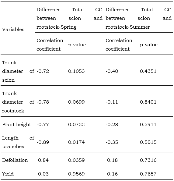 In view of the results obtained in the present study, in which there is evident relationship between the content of CGs and the growth parameters, which in turn are related to the graft compatibility, a correlation study was carried out between the differences in the total content of CGs from scion and rootstock and the growth variables (Table 1). The results indicate that the difference in CG concentration between scion and rootstock in the spring really influences the growth of plants (trunk diameter, plant height, length of branches, and defoliation). This behavior is probably induced by the different levels of incompatibility of the studied combinations.