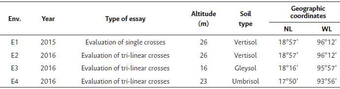Env. = environment; E1 = Medellin de Bravo, Veracruz, Mexico (2015); E2 = Medellin de Bravo, Veracruz, Mexico (2016); E3 = Carlos A. Carrillo, Veracruz, Mexico (2016); E4 = Huimanguillo, Tabasco, Mexico (2016); NL = north latitude; WL = west longitude.