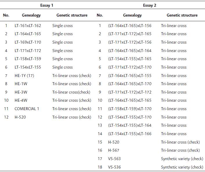 The present study was an advance focused on the development of single and tri-linear crosses from tropical elite germplasm, led by the Cotaxtla Experimental Field Corn Program belonging to the NIFALR. Table 1 shows different tests performed in environments of the state of Veracruz and Tabasco, Mexico during the years 2015 and 2016, respectively.