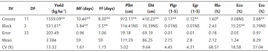 *Significant at 0.05; ** Highly significant at 0.01, according to the Duncan Test (P < 0.05); NS = non-significant; SV = source of variation; DF = degrees of freedom; Mf = male flowering; Ff = female flowering; Plht = plant height; Eht = ear height; Plgr = plant grade; Egr = ear grade; Rlo = root Lodging; Eco = ear cover; Ero = ear rot; CV = coefficient of variation.