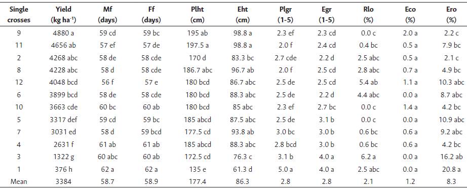 *Averages with different letters in the same column show significant differences (P < 0.05), according to Duncan's test; Mf = male flowering; Ff = female flowering; Plht = plant height; Eht = ear height; Plgr = plant grade, where 1 is the best and 5 is the worst; Egr = ear grade, where 1 is the best and 5 is the worst; Rlo = root lodging; Eco = ear cover; Ero = ear rot; 1 = LT-161xLT-162; 2 = LT164xLT165; 3 = LT-169 x LT-170; 4 = LT-171xLT-172; 5 = LT158xLT159; 6 = LT154xLT155; 7 = HE-1Y (17) (check); 8 = HE-1W (check); 9 = HE-3W (check); 10 = HE-4W (check); 11 = COMERCIAL 1 (check); 12 = H-520 (check).