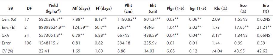 *Significant at 0.05; **Highly significant at 0.01, according to the Duncan Test (P < 0.05); NS = non-significant; SV = source of variation; Gen. = genotype; Env. = environment; DF = degrees of freedom; Mf = male flowering; Ff = female flowering; Plht = plant height; Eht = ear height; Plgr = plant grade; Egr = ear grade; Rlo = root lodging; Eco = ear cover; Ero = ear rot; CV = coefficient of variation.