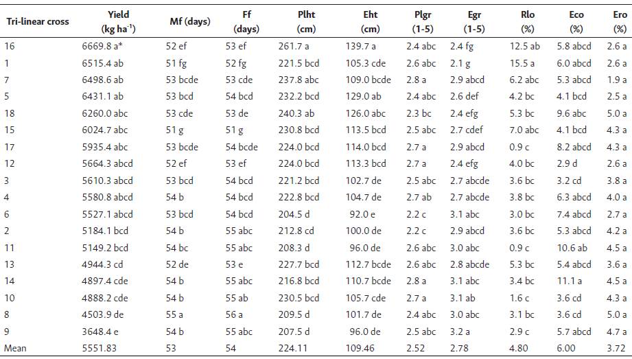 *Averages with different Letters in the same coLumn show significant differences (P < 0.05), according to Duncan's test; Mf = maLe flowering; Ff = femaLe flowering; PLht = pLant height; Eht = ear height; PLgr = pLant grade, where 1 is the best and 5 is the worst; Egr = ear grade, where 1 is the best and 5 is the worst; RLo = root Lodging; Eco = ear cover; Ero = ear rot; 1 = (LT-164xLT-165)xLT-156; 2 = (LT-171xLT-172)xLT-165; 3 = (LT-171xLT-172)xLT-156 4 = (LT-164xLT-165)xLT-164; 5 = (LT-154xLT-155)xLT-165; 6 = (LT-171xLT-172)xLT-170; 7 = (LT-164xLT-165)xLT-155; 8 = (LT-164xLT-165)xLT-170 9 = (LT-171xLT-172)xLT-172; 10 = (LT-164xLT-165)xLT-165; 11 = (LT-158xLT-159)xLT-170; 12 = (LT-154xLT-155)xLT-170; 13 = (LT-154xLT-155)xLT-164 14 = (LT-154xLT-155)xLT-166; 15 = H-520; 16 = H-567; 17 = VS-563; 18 = VS-536.