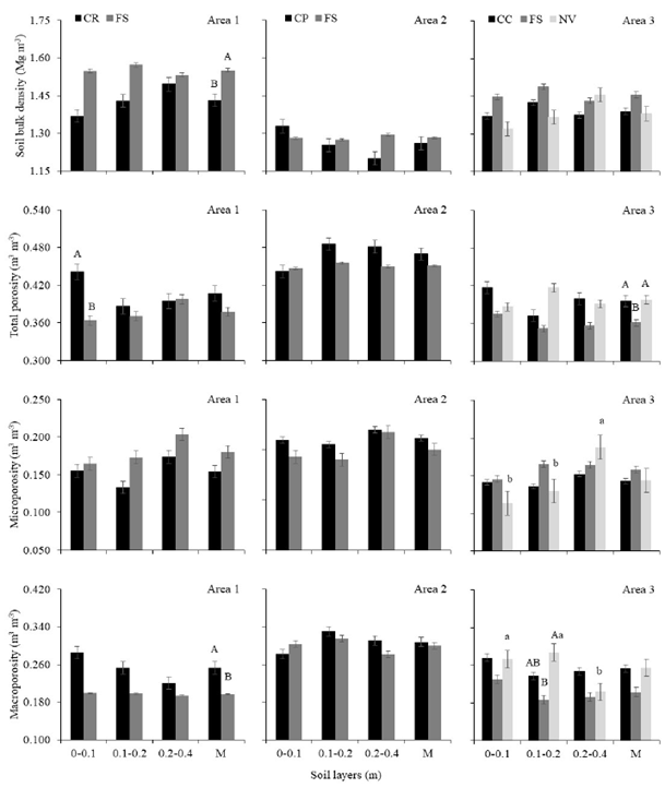 In area 1, CR presented a soil bulk density (1.43 kg dm- 3) lower than FS (1.55 kg dm-3) on average in soil layers, while in areas 2 and 3 the treatments did not differ statistically in the soil layers (Fig. 1). In area 1, CR presented the highest total porosity (0.44 m3 m-3) in the 0-0.1 m layer, in contrast with FS (0.36 m3 m-3), not differing in the other soil layers. In area 2, the treatments did not differ from each other in the soil layers under study. In area 3, CC and NV presented, on average, the highest total porosity (0.40 and 0.40 m3 m-3), while FS presented the lowest (0.36 m3 m-3).
