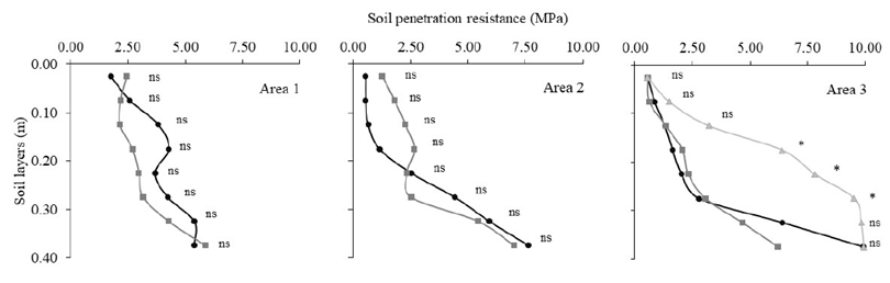 Figure 2: Soil penetration resistance under conilon coffee intercropped with rubber tree ( ) and in full sun ( ) in area 1; intercropped with papaya ( ) and in full sun ( ) in area 2; and intercropped with coconut ( ), in full sun ( ) , and in the native vegetation ( ) in area 3. * = ignificant (Tukey’s test, p > 0.05), ns = not significant.