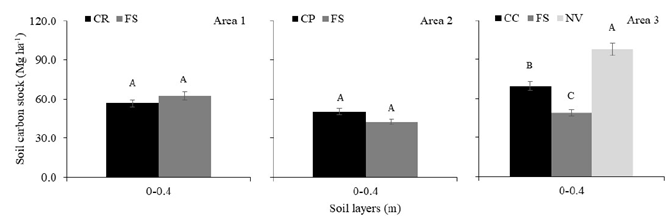 Figure 5: Soil carbon stock under conilon coffee intercropped with rubber tree (CR) and in full sun (FS) in area 1; intercropped with papaya (CP) and in full sun (FS) in area 2; and intercropped with coconut (CC), in full sun (FS), and in the native vegetation (NV) in area 3 in a 0-0.4 m soil layer. Upper case letters compare treatments (Tukey’s test, p > 0.05).