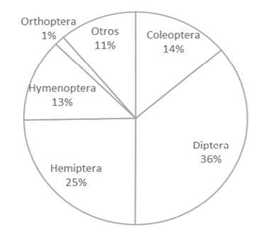 Durante los muestreos fueron colectados un total de 7418 individuos, clasificados hasta el nivel de orden (Diptera, Hemiptera, Coleoptera, Hymenopteraa, Orthoptera) (Figura 2). Algunos individuos fueron clasificados a nivel más específico, llegando hasta familia y especie. El mayor número de insectos fue encontrado en el orden Diptera (2670 individuos), sin embargo, la mayoría fueron zancudos, una especie que no afecta ni beneficia al cultivo en términos agronómicos. Esta alta población (41 % del total de díptera) podría deberse a factores climáticos y a la alta humedad de la zona.