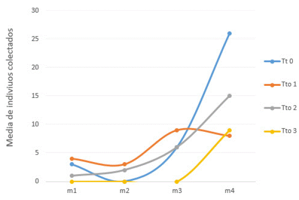 Así mismo, se observaron diferencias en el comportamiento de la población Delphacidae, a lo largo del tiempo, y de acuerdo con el factor tratamiento. Así, con el tratamiento control (Tt 0), hubo mayor crecimiento de esta población de insectos, en cada muestreo. Para el tratamiento de mayor concentración (Tto 3), durante los tres primeros muestreos, no se encontraron individuos de esta familia de insectos. No obstante, el hallazgo en m4 (Tto 3), puede ser por el incremento de arvenses que no fueron manejadas culturalmente.