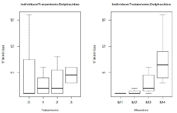 De acuerdo con el análisis de varianza, se encontró diferencia significativa entre la media de las poblaciones de Delphacidae, tanto en tratamientos como en muestreos (con un nivel de confianza del 95 %). En la Figura 4 (cajas y bigotes), se indica que existe diferencia en las medianas de los muestreos y una mayor en el m4, con respecto a los demás. En cuanto a los tratamientos, se tiene un caso similar en el que la mediana del tratamiento con mayor concentración del extracto (Tto 3), se encuentra por encima de los demás tratamientos, incluyendo al testigo (Tt 0). Para determinar estas diferencias se realizó el análisis de varianza (Anova), con el modelo de interacción entre los factores muestreo y tratamiento, con la media de individuos como variable respuesta. Se obtuvo como resultado una diferencia estadísticamente significativa entre los factores muestreo, tratamiento y la interacción de estos con la variable respuesta.