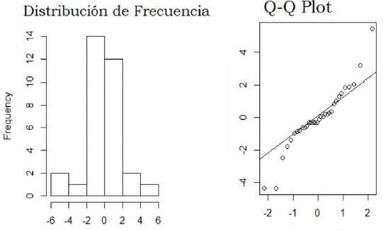 En la Figura 5 se muestra la distribución de datos (residuales del modelo del Anova), y se confirma el supuesto de normalidad de los datos (Figura 5) de acuerdo con la prueba de Shapiro, por lo que se acepta el uso de esta prueba para la comparación de las medias.
